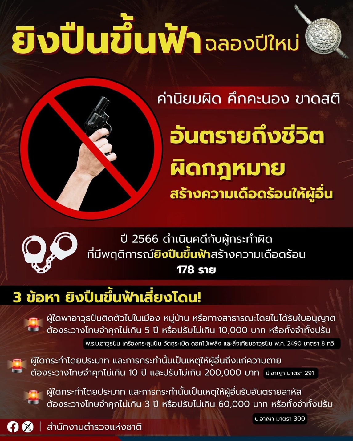 รอง โฆษก ตร.เตือน ‘ยิงปืนขึ้นฟ้า’ เฉลิมฉลองเทศกาลปีใหม่ ก่อให้เกิดอันตรายถึงชีวิต ผิดกฎหมาย และสร้างความเดือดร้อนให้ผู้อื่น ขอความร่วมมือประชาชน ให้ความร่วมมือเป็นหูเป็นตา