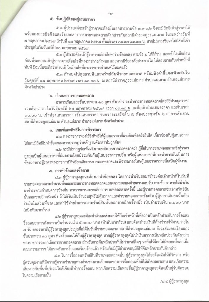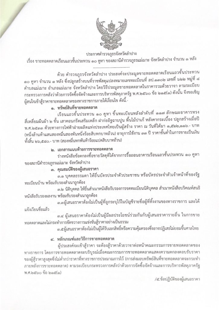 ประกาศตำรวจภูธรจังหวัดลำปาง เรื่อง ขายทอดตลาดเรือนแถวชั้นประทวน 10 คูหา ของสถานีตำรวจภูธรแม่เมาะ จำนวน 1 หลัง 9 พฤษภาคม 2567 โดย maemoh.lampang.police.go.th / ข่าวประชาสัมพันธ์,ข่าวประชาสัมพันธ์,ข่าวฝากประชาสัมพันธ์ FacebookFacebookXXLINELine
